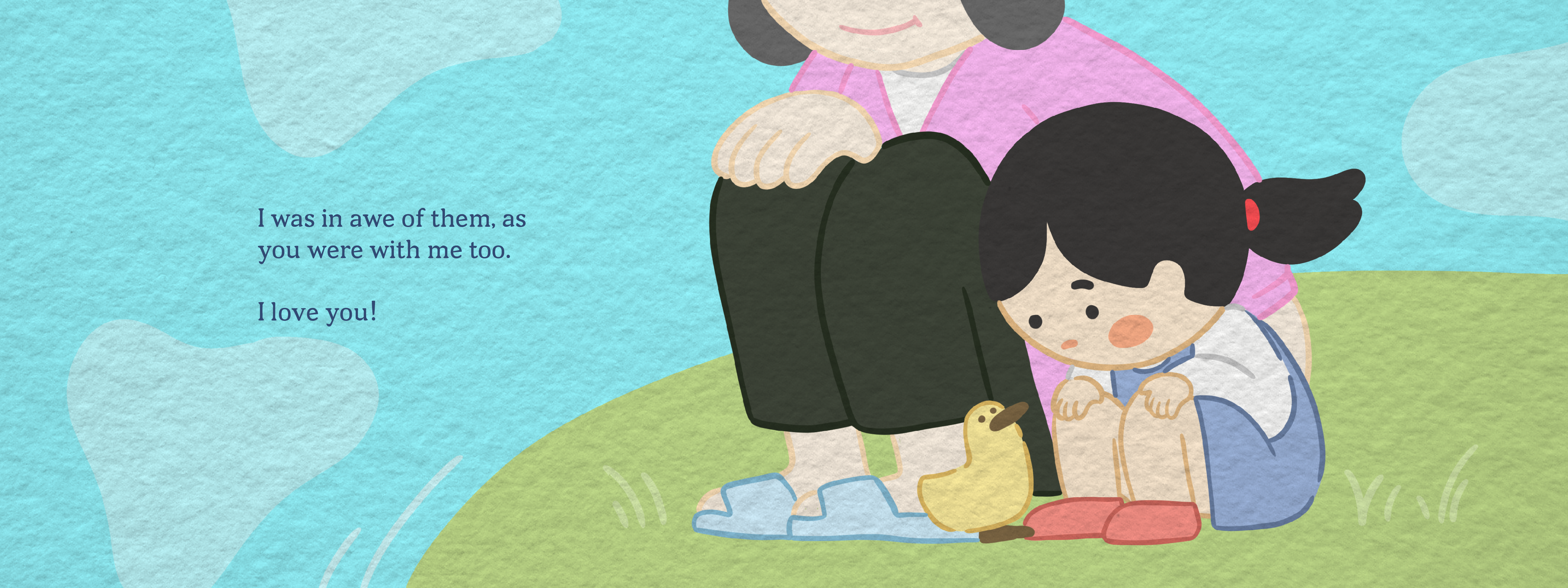 This book was created with the intention of sharing a heartwarming story regarding a gradual bond between a child and her grandma with their hobby of feeding the ducks, as well as softly educating the readers on what you can feed the ducks if you’re interested in doing so. This was also a way of expressing the concept that birds can bring people together in many different ways, along with the encouragement towards children to appreciate and be more aware of the nature around them.